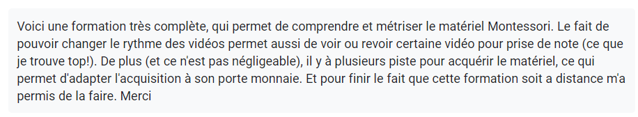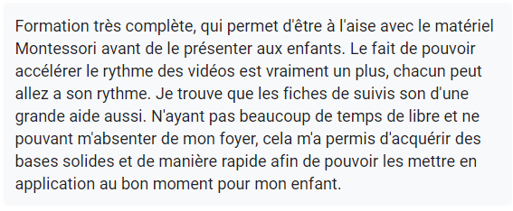 Il y a en tout plus de 5h de visionnage pour cette formation. Mais tu devras prévoir de la prise de note, de revoir certaines vidéos, de prendre du temps pour fabriquer ton matériel et pour en acheter éventuellement. Tu auras aussi besoin de prendre du temps pour t’entraîner à présenter chaque matériel. Selon le temps dont tu disposes, il te faudra donc plusieurs semaines ou mois pour la suivre.